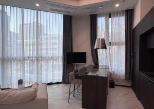 Moderní apartmány s vysokými stropy a velkými okny nabízely světlé a příjemné prostředí. Poloha byla výhodná, v blízkosti několika stanic metra, obchodů a zajímavostí jako svatyně Jongo, která byla snadno dostupná pěšky. K dispozici byla plně vybavená kuchyň se myčkou nádobí, pračka se sušičkou i samostatná skříň na napařování oblečení. V pracovních dnech byl pro dva hosty zdarma zajištěn snídaňový servis. Zastávka letištního shuttlu 6001 u hotelu Baiton byla jen pár kroků od budovy, což usnadňovalo dopravu na letiště.