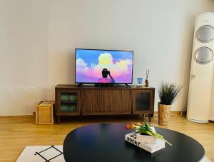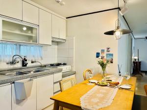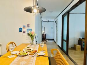 Inside the apartment, guests can enjoy a fully equipped kitchen featuring a refrigerator, microwave, electric kettle and complete kitchenware alongside a dining table for meals. The unit is fitted with individually controlled air conditioning and heating to ensure comfort throughout any season while room amenities include towels, non-feather pillows and a washing machine.