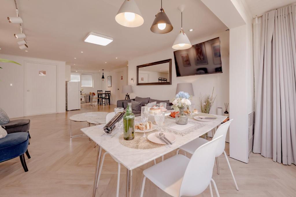 Guests have access to free WiFi throughout all areas along with cable TV channels including streaming services on a flat-screen television. Additional amenities include an ironing board with iron, washing machine, tumble dryer for clothes, dining table, work desk, heating, individually controlled air conditioning in rooms plus safety features such as fire extinguisher in-room units smoke detector carbon monoxide detector express check-in/check-out parking garage free onsite parking ground floor unit quiet street views.