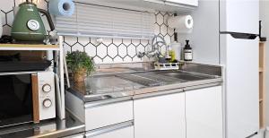 The fully equipped kitchen includes a refrigerator, microwave oven, coffee machine, electric kettle and kitchenware all arranged around a dining table. Additional amenities include a washing machine and tumble dryer for clothes. Entertainment options feature a flat-screen TV with bedside sockets available to keep devices charged while smoke detectors along with carbon monoxide detectors ensure guest safety.