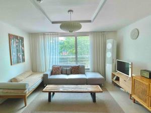 Inside the apartment, guests will find three separate bedrooms furnished with four beds total along with a living room providing ample space to relax on the sofa provided. The fully equipped kitchen includes essential appliances such as a microwave, refrigerator, electric kettle and tumble dryer for clothes which makes meal preparation convenient during your stay.